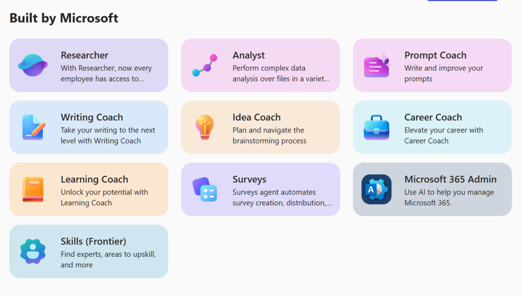 Copilot agenti so prilagojeni digitalni pomočniki, ki delujejo znotraj Microsoft 365 okolja (Teams, Outlook, SharePoint, Dynamics 365 itd.) in uporabljajo umetno inteligenco za izvajanje konkretnih nalog.