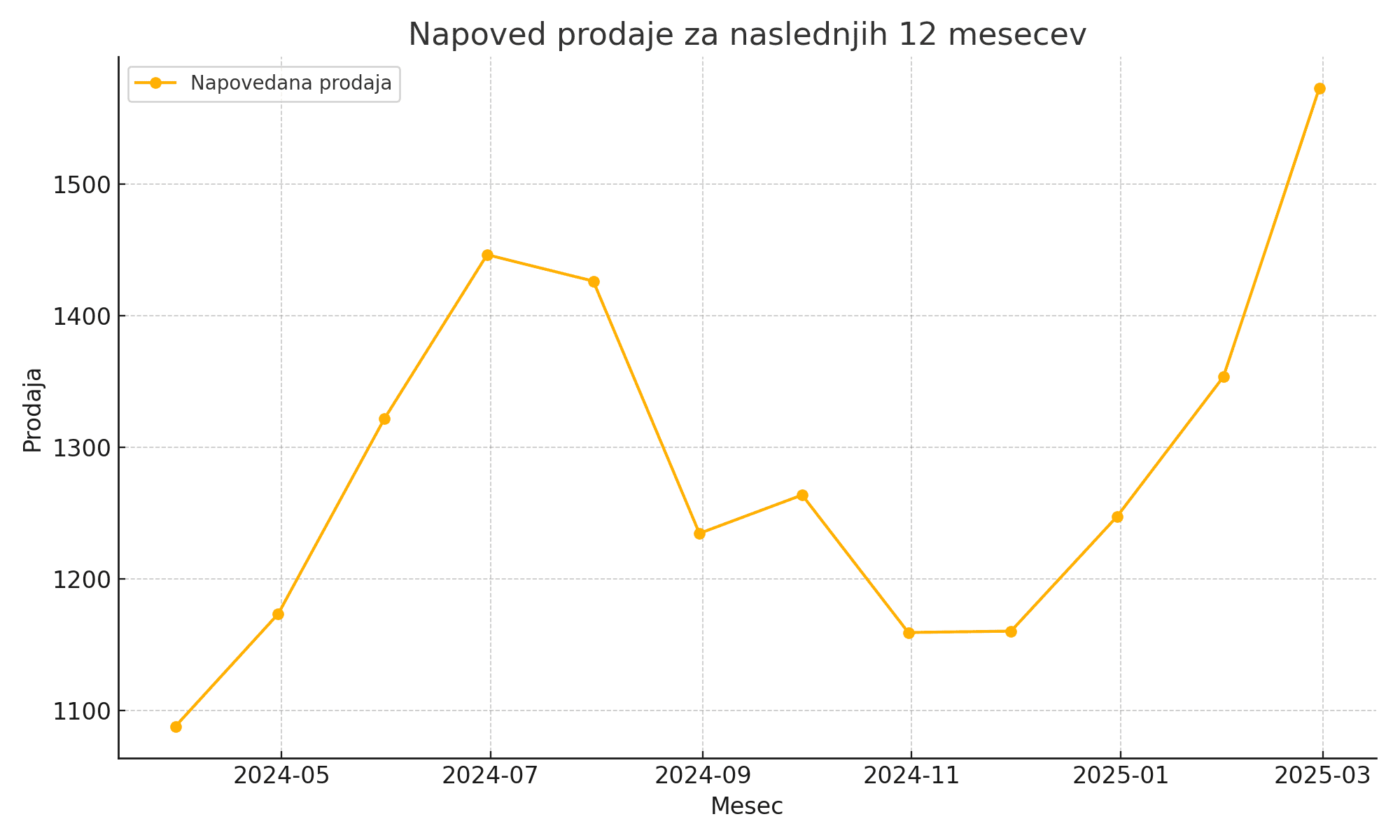 Graf napovedi prodaje za naslednjih 12 mesecev, ki prikazuje pričakovane trende in sezonska nihanja.