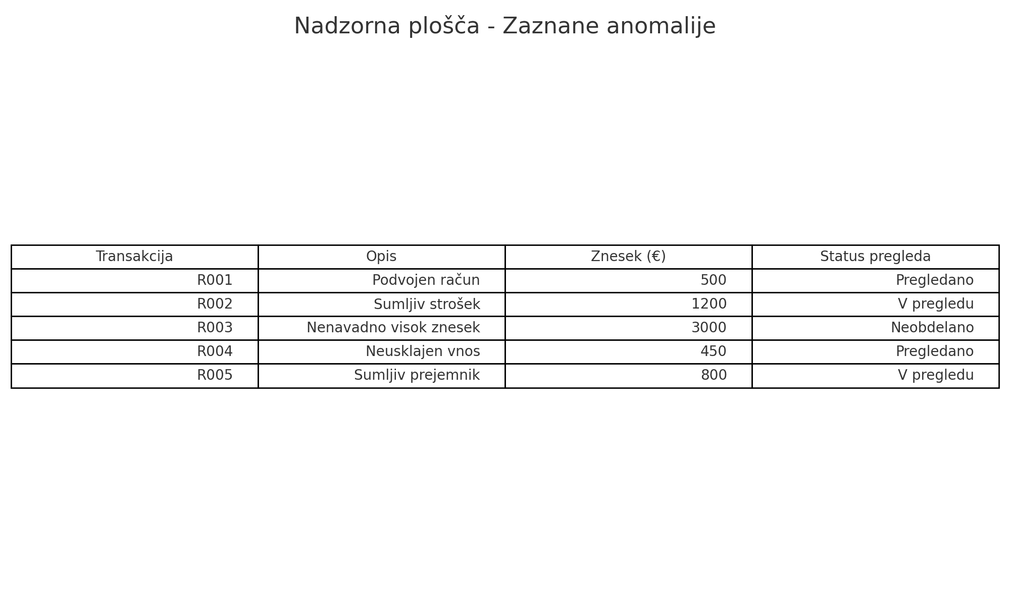 Grafični prikaz nadzorne plošče s seznamom zaznanih anomalij (npr. podvojen račun, sumljiv strošek) in statusom pregleda.