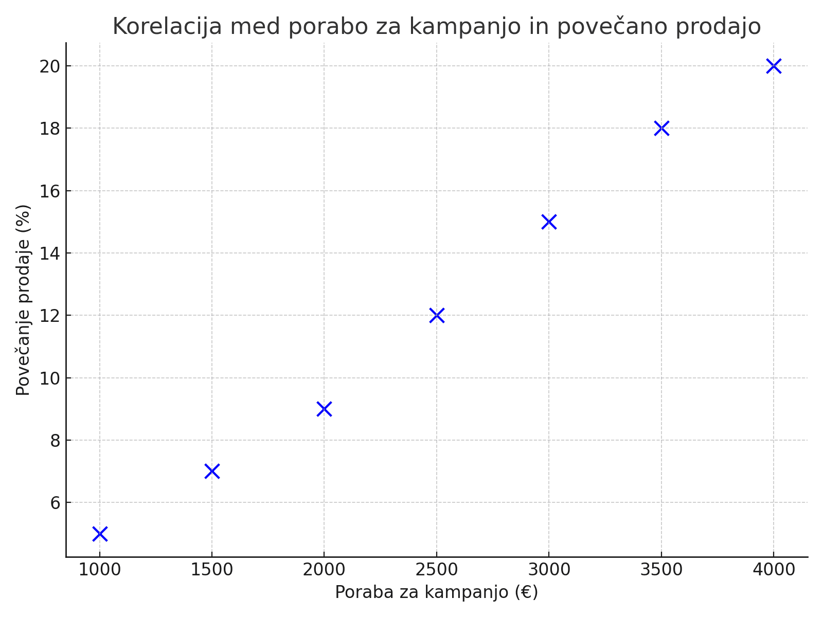 Scatter plot, ki prikazuje korelacijo med porabljenimi sredstvi za posamezno kampanjo in doseženim povečanjem prodaje.
